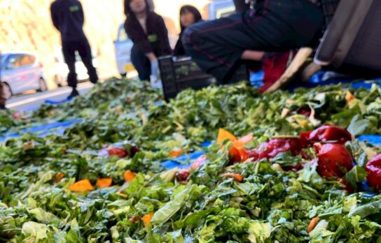 給食の試食の後は、実際に有機野菜を納品しているYASUKI FARMさんへ。 寒空の下でも、陽気な音楽が流れてくるような明るい笑顔で迎えてくれたのは、鳥越靖基(トリゴエヤスキ)さんと有機農業の研修真っ最中と…