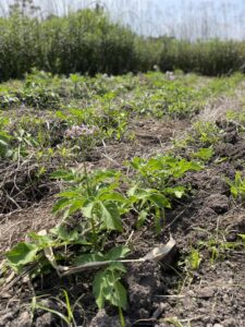 平山さん自身の畑に案内していただくと、昨年11月に種を蒔いたという小麦や、花がチラホラ咲き始めたじゃがいも、種が大きく実っている湯島大根等の活き活きとした姿が。