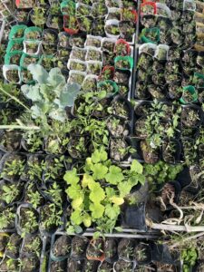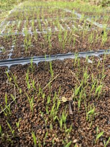 ハウス内の苗床には、田植えを待つみどり米(無農薬のもち米)や夏野菜、ハーブ等、たくさんの種類の苗が並んでいた。