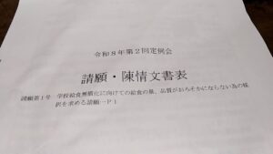 2/12に給食無償化になっても、量・質がおろそかにならないでねという、請願を賛同者104名の署名とともに提出して